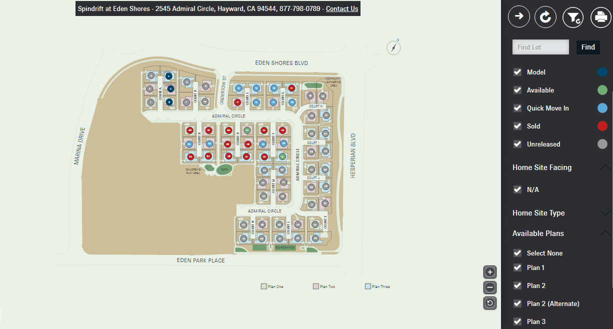 Spindrift at Eden Shores features include: 66 two-story, single family homes; Located in the desirable Eden Shores area; Centrally located in the heart of the San Francisco Bay Area; Minutes from BART, Interstates 880 and 580, and the San Mateo Bridge, providing flexible access to all neighboring cities and convenient commutes to work and school throughout the San Francisco Bay Area; Grocery stores, shopping malls, restaurants and fine dining, entertainment selections and gyms are all located within 5 miles of Spindrift; Enjoy easy access to services, plus local shopping at Costco, Union Landing shopping center and Southland Mall; Spindrift community park with children’s play area; Across from Alden E. Oliver Sports Park with athletic fields, basketball courts, playground, snack bar & picnic areas with grills ; Just minutes away, the San Francisco Bay Trail, and the tideland preserve at the Hayward Regional Shoreline is perfectly suited for walking, jogging and biking; The Gordon E. Oliver Park is 1/4 mile away and features several barbecue and picnic areas, 3 tennis courts, a basketball court and a large playground; Hayward is home to California State University East Bay and Chabot Community College, just 3 miles from Spindrift; Hayward community events include summer street parties, music and wine festivals, the Light Up the Season celebration, as well as the farmer’s market in historic downtown